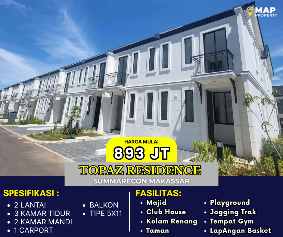 Sedang mencari rumah 2 lantai yang nyaman, strategis, dan terjangkau di Makassar? Topaz Residence hadir sebagai pilihan terbaik untuk Anda. Berlokasi di kawasan premium Summarecon Makassar, hunian ini menawarkan kenyamanan hidup modern dengan fasilitas lengkap serta akses mudah ke berbagai pusat aktivitas kota.